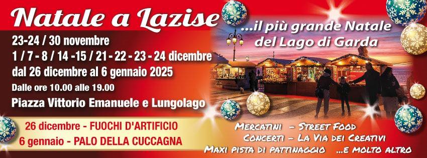 Piazza Vittorio Emanuele e il Lungolago Marconi di Lazise ospiteranno i Mercatini di Natale. Dal 27 Novembre al 26 dicembre, i mercatini ci saranno solo nel weekend, dal 26 dicembre al 9 gennaio ci saranno tutti i giorni. Per tutto il periodo verrà allestita una pista di pattinaggio presso il parco Prà del Principe.